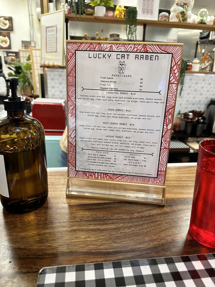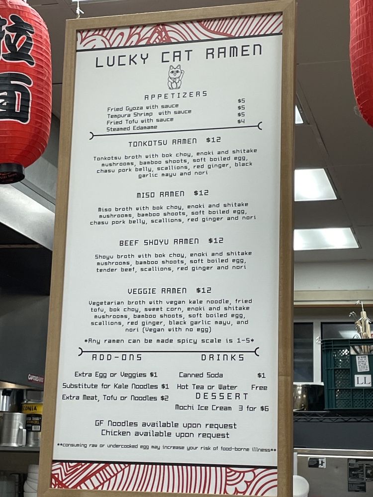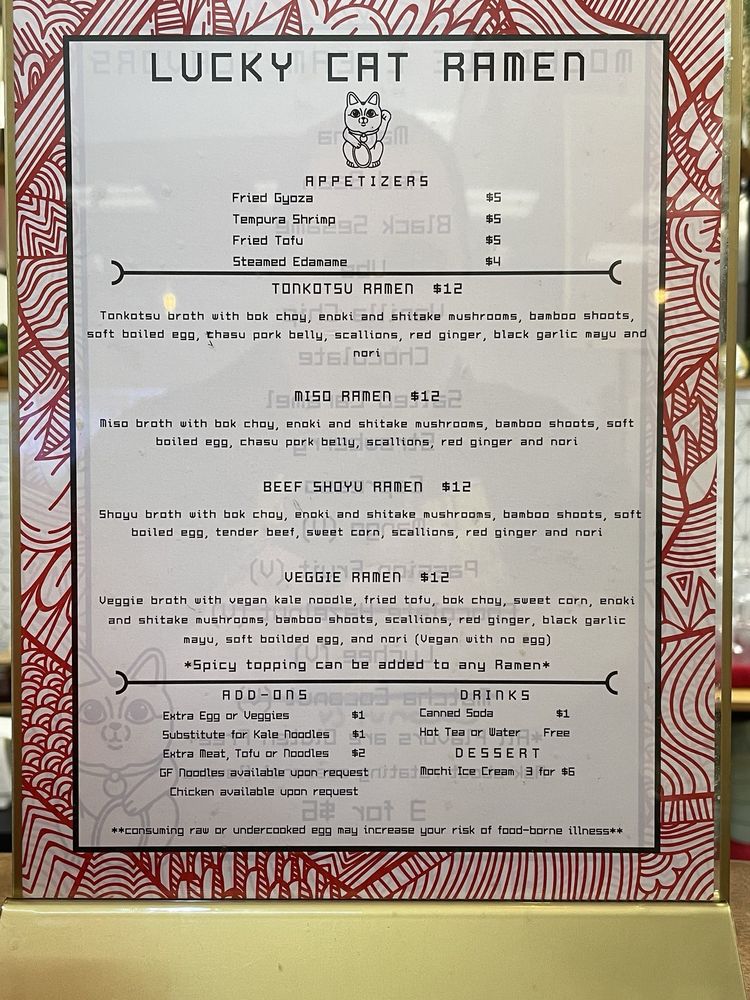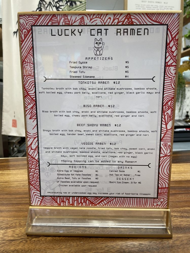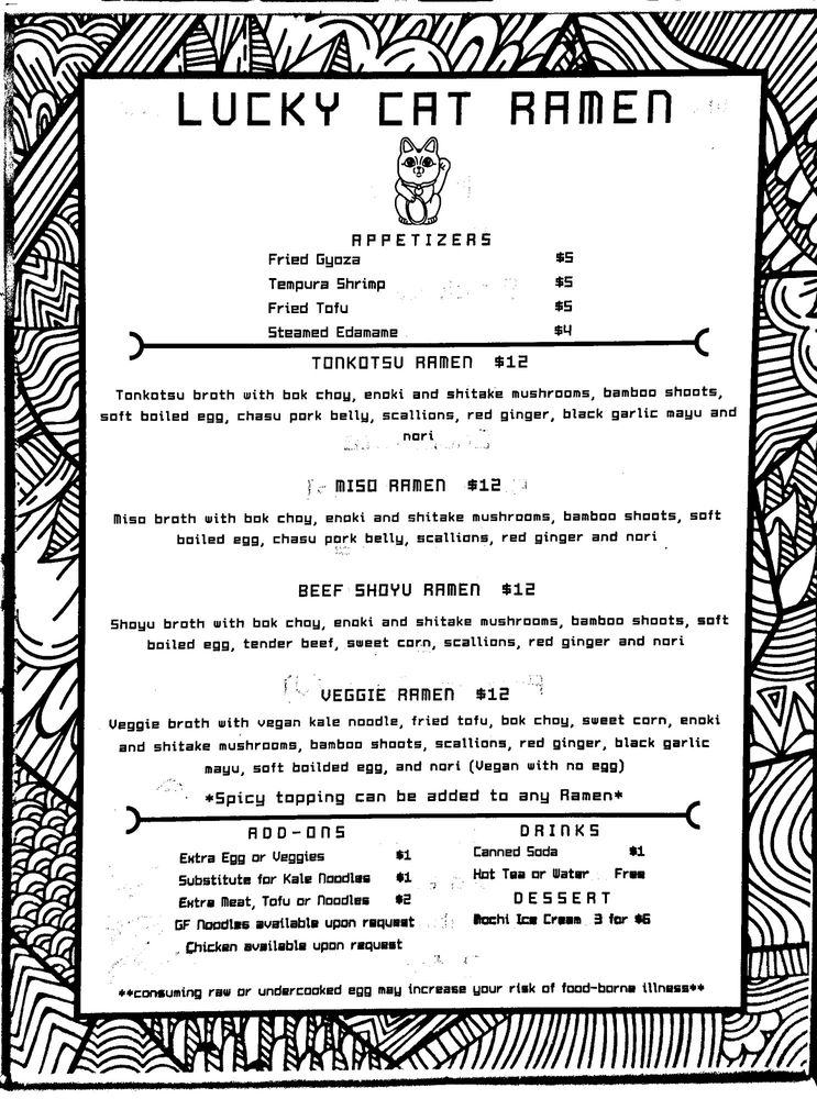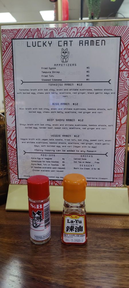 Introducing the menu at Lucky Cat Ramen! Located in Portland, this Asian-owned restaurant offers a variety of ramen options including tonkotsu, miso, veggie, and beef shoyu. Customers rave about the fresh ingredients, generous portion sizes, and customizable spice levels ranging from 1-5. The menu may be simple, but the flavors are complex and satisfying. With friendly service, quick delivery, and affordable prices ($12/bowl), Lucky Cat Ramen is a hidden gem worth trying. Reviews mention the cozy atmosphere with cat figurines, limited seating, and a welcoming vibe. Whether you're a ramen enthusiast or new to the dish, Lucky Cat Ramen promises a memorable dining experience with delicious, authentic Japanese flavors. Consider bringing your own container for a sustainable dining option. Don't miss out on this top-rated restaurant in Portland!